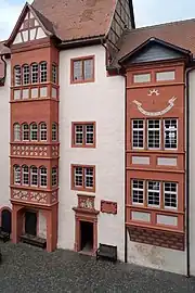 The stately four-story building is 32.5 meters long and is just under nine meters wide. The courtyard-side facade is divided by two high oriels, one of which is a stander bay. On the left oriel, the blind tracery on the two main floors and the coats of arms of the builders in the basement are conspicuous. On the right oriel, there are mirrored ashlars carefully decorated with a checkerboard pattern. They represent an outstanding example of Renaissance stonemasonry. Due to the fire of 1621, the top floor of the oriel, which today bears a sundial, is not original. Between the two oriels is the portal with the coat of arms of Ysenburg and von Gleichen, and next to it is the foundation stone with an inscription from 1573.[26]