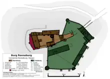 The ground plan of Ronneburg reveals the rectangular core castle with its robust defensive wall. Together with the keep and the hall building, it is the oldest part of the castle dating from the second quarter of the 14th century. The extensive outer bailey located to the south and east of the complex is a product of a later construction phase, spanning from 1538 to 1550.[7]