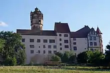 Directly north of the hall building, in the corner between it and the old building, one can find the bakehouse. It has an impressive Renaissance gable on the exterior and dates to the 16th century. The shell tower of the late medieval Zwinger, which is directly adjacent to the outer corner, was extended to serve as a stair tower during the building's expansion.[25]