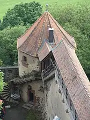 The keep, standing at a height of 32 meters,[21] features a round ground plan with a diameter slightly exceeding eight meters. Its masonry, which is consistent up to the helmet, is believed to belong to the earliest construction phase. In the thinner masonry of the spacious hall on the fourth floor, the remains of a staircase embedded in the wall indicate its connection to the Renaissance-era helmet. The original entrance can be observed on the courtyard side on the third floor, situated at a height of about ten meters, as a pointed arched gate. The two floors below served as dungeons and were only accessible from above via a fear hole in the vault. The current windows were installed in 1581, requiring the wall to be broken through for their installation when it was intended to use these floors for residential purposes as well. In the 15th century, a new lateral access had already been created through an attached stair tower with a spiral staircase. Consequently, the 57-step spiral staircase within the keep only commences on the third floor and starts above a three-armed arch, likely because the original hole to the dungeon was not yet covered.[22]