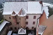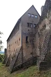 The Saalbau, also known as the Palas, is situated on the west side of the core castle and is essentially one of the original castle buildings. The current structure has a floor area of 25 x 11.5 meters and spans the entire width of the western core castle.[21] On its south side, it seamlessly connects to the battlement of the upper gate building. The central stair tower in front of the building above the cellar neck is an addition from the 15th century. The roofing over the cellar entrance, featuring a half-timbered parlor, dates to 1555. On the courtyard-side facade, there is a polygonal bay window made of sandstone ashlars with cross-frame windows to the left of the stair tower on the upper floor. This bay window was created in the last third of the 14th century when a Gothic chapel was built there, of which it formed the apse.[23] The building houses a vaulted cellar, as well as larger living and courtrooms. It also contains a castle kitchen, which, however, was only installed during the Renaissance. In the past, the first floor featured a larger hall, which was later converted into a smaller hall with a kitchen. Half-timbered walls from the 15th century are still preserved on the middle floor. The upper floor had to be extensively rebuilt after the fire damage of 1621, so medieval elements are present only in the stone architectural components.[24]