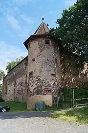 A round tower was built between 1546 and 1549 to protect the southwest corner of the outer castle. A pointed-arched portal dates back to 1548, and the adjoining section of the wall (the west wall of the outer bailey) was completed in 1549. The foundation stone from 1546 was later placed in the upper floor and bears the inscription, "Do disz Mauer angefangen war, Graf Jorg den ersten Stein legt dar, des Augusts achtzehnten behalt, funffzehen hundert sechs vitzih zalt - 1546" (This wall was begun, Count Jorg laid the first stone, August's eighteenth kept, counting fifteen hundred six and twenty - 1546). The spiral staircase on the outside of the tower was added as late as 1905, using the reused steps from a staircase in the bakehouse.[33]
