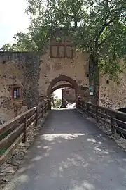The outermost gate of the core castle is an ogival gate with a small, one-story gatehouse that now serves as a museum ticket office. Above the gate, there is a coat-of-arms stone bearing the arms of Count Philipp von Ysenburg-Büdingen and his wife Amalie von Rieneck, along with the date 1527.[33]