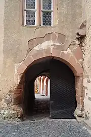 To the southwest of the gate, the passage is flanked by a sturdy round tower. During the construction of the gate, a portion of the tower's masonry was removed, indicating that the tower is older than the current gateway and was adapted to it when the gate was reconstructed. In the 16th century, when the gatehouse to the north was converted into the well house, the guardroom was relocated to the first floor of this tower.[31]
