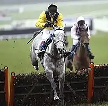 Rooster Booster was a gelding whose grey coat (inherited from his dam Came Cottage[1]) and racing style made him easily recognisable. He was the only horse of any consequence produced by the unsuccessful racehorse Riverwise.[2] He was originally trained by his owner Norman Richard Mitchell in Dorset but had his biggest successes after he was bought by Terry Warner in 2000 and sent to the stable of Philip Hobbs at Withycombe in Somerset.
