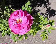 'David Thompson' is a medium, bushy Hybrid rugosa rose, 3 to 4 ft (0.91–1.22 m) in height, with a 4 to 5 ft (1.2–1.5 m) spread. It has a double, cupped bloom form of medium-sized 2.8 in (71 mm) flowers. Blooms vary in color from purplish-pink to deep red. Flowers often display streaks of white and the stamens are pale yellow. They are borne in short-stemmed clusters of 3 to 7.[2] The rose has a strong, sweet scent. The rose blooms in flushes throughout the season. It is a very hardy plant and is disease resistant. The leaves are small and medium green in colour, and have a tendency to turn brown at the edges.[3]