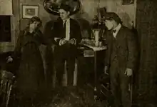 Tom brings Kid Hogan to the flat some days later to pay him a gambling debt. A dispute leads to the shooting of Hogan through the forearm and his brother, a cheap ward politician and plain-clothes man in the police department, hears the shot from the street, meets Tom, as he tries to get away, and is about to arrest him when Tom charges Hogan with having tried to assault Nell. Although Hogan knows he is innocent, he realizes the gravity of the charge and tells his brother to let Tom go - he'll get even. Nell assents to the charge her brother makes to shield him and Hogan decides he will get a woman associate of his who lives in the next apartment, to frame-up the girl.