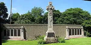 A large memorial at the furthest point from the current Pilrig Street entrance, lying against Broughton Road wall near North Pilrig Heights, marks a mass grave and commemorates the Gretna rail disaster of 22 May 1915, in which 215 soldiers of the 1st/7th Battalion The Royal Scots were killed.[2] The men, mostly from Leith, were on their way to board ship at Liverpool in order to travel to the battlefront at Gallipoli. The handful of survivors were sent onwards the following day. The bodies of those killed in the railway disaster were returned to Leith and buried with great aplomb on 24 May with the 15th and 16th battalions Royal Scots serving as guard of honour. These are among 270 First World War casualties and 36 Second World War casualties interred at Rosebank.[4]