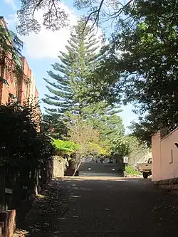 Woollahra Council was established in 1860. As rates increased and the need for more houses arose, Mr. Campbell began to lease some of his garden to various friends. Kalingra Cottage was built by Mr Maclean, whose wife was a Campbell, Kelston by Mrs Dunsmuir, Harll by Mr Trebeck and Lillingston by Mr Caird, whose daughter married a son of Alexander Campbell. Eylstan was a big house on the corner of Trelawney Street built by Miss Cook, and was a school for girls; later the Gilchrist family lived there, and Mr Marks, who also built Trelawney. The terrace to the north of Rosemont gates dates from about 1860, and at one time Mme. (opera diva, Nellie) Melba lived in one of the houses, and all the neighbours could enjoy hearing that exquisite voice trilling scales. Each gate is flanked with miniature stone pillars and the Rosemont entrance of curved stone walls leads to a long, tree-shaded, avenue, one of the few relics of the past.[8][1]