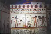 The Rosicrucian Egyptian Museum contains a composite replica of an ancient Egyptian rock-cut tomb, based on photos and sketches taken by Rosicrucian expeditions to tombs at Beni Hasan, in order to give the guests the experience of being in such an excavation. Below are photographs of the interior of the replica tomb, largely containing scenes from the Book of the Dead. The dark interior of the tomb replica is evident.