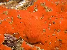 The red sponge nudibranch is a yellow-orange to red dorid with scattered small black spots on its notum. It is extremely well camouflaged on its prey sponges. Its gills are arranged around the anus and its rhinophores are perfoliate. It may reach a total length of 30 mm.[3][4]