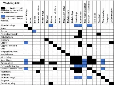 Example of Rotary friction welding weldability table.[31] This is the basic table because the currently known list of materials is much larger and the name alloy systems are classified by a number system (ANSI) or by names indicating their main alloying constituents (DIN and ISO).