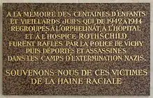 In the middle of the 19th century, James de Rothschild founded a hospital at 76 rue de Picpus which included a Hospice for the elderly.[1] The hospital opened on 25 May 1852 and was initially opened to treat and welcome Jewish patients.[2]