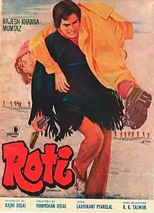 Roti (transl.Chappati or Flatbread) is a 1974 Indian Hindi-language action film, produced by Rajni Desai and Rajesh Khanna under the banner Aashirwad Pictures Pvt. Ltd and directed by Manmohan Desai. It stars Rajesh Khanna and Mumtaz, with music composed by Laxmikant Pyarelal. This film was released on 18 October 1974, along with Benaam and Roti Kapda Aur Makaan.[1] Kader Khan was reportedly paid 1.21 lakhs for writing dialogues for the film.[2] The film was remade in Telugu as Neram Nadi Kadu Akalidi, starring N.T. Rama Rao and Manjula.