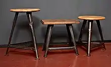 In a document celebrating the 50th anniversary of the company, the Rowac stool is touted as the first steel stool to be manufactured and sold.[2] The first model, a three-legged stool with a round wooden seat, was conceived in 1905 and presented for the first time at the Leipziger Michaelis-Messe (Leipzig Michaelis Trade Fair) in 1909.[23] Rowac advertised the stool in a brochure as follows: "One principle applies to every business: work that can be done just as well sitting down should never be done standing up".[15] At first it was a big gamble to bring this entirely new product to market.[2] But as early as 1909, it was praised in the General Journal for Watchmaking (Allgemeinen Journal der Uhrmacherkunst) for its great durability compared to simple wooden stools for use in workshops. In addition, the purchasing costs were also much lower because repairs were virtually eliminated. Among others, the Rowac stools were brought to market by the retailers Gustav Sturm in Leipzig and Wilhelm Herbst in Berlin.[10][24] By the 1920s at the latest, they were in widespread use, especially in workshops and factories. Today, the three-legged stool is one of Rowac's best-known products. It was not only offered in different heights, but also with a backrest (model IV), as a four-legged version with a rectangular wooden seat (model II), as a folding stool and for special applications also as a height-adjustable swivel stool (model III). A rare example is model Ib, which is welded rather than riveted like all the other models.