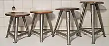 The design of the Rowac stool represents the functionalist ideal advocated by the Bauhaus, among others, in Germany in the interwar period, in which practicality and utility were intended to be at the centre of aesthetic interest. From 1926 on, the stools found their way into the classrooms and workshops of what was probably the most influential art school of the new, modern style, the Bauhaus Dessau.[25] The fact that Walter Gropius chose the Rowac stool, of all things, for the Bauhaus building is believed to be due to its technically refined yet simple construction.[11] Rowac advertised its stool in a Bauhaus brochure as follows: "the tried and tested rowac stools are in use in all rooms of the bauhaus!"[29] Photos from the Bauhaus archive show that Rowac stools were not only used as seating in the workshops, but also for all kinds of other activities in the Prellerhaus and by the in-house band (Die Bauhauskapelle).[30][31][32][33][34]