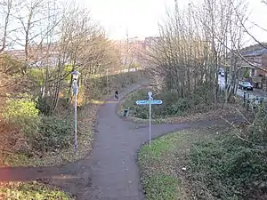 Rowntree Halt was a minor unmanned railway stop on the Foss Islands branch line in York. Located on the southern edge of the Rowntree's chocolate factory, Rowntree Halt was opened in 1927 by the London and North Eastern Railway to provide a low-volume, not publicly advertised passenger service to the Rowntree factory for workers commuting from areas south of York such as Selby and Doncaster. The halt itself was little more than a single short platform located a few yards west of a signal-protected siding that allowed freight directly into the factory complex. Passenger services ceased in 1988, and the station was officially closed on 8 July 1988.[1][2] The line was dismantled and turned into a cycle track.