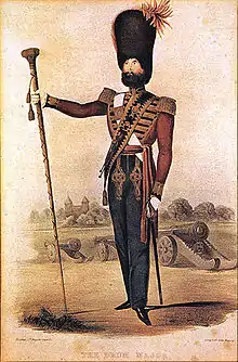 Originally the only headdress worn by when mounted, was the blue forage cap. As a marching band, all RA bands wore the busby. In 1894 a new style black sable busby was introduced (the earlier busby having once replaced the shako from c. 1850 until the end of the 1860s) with a scarlet bag on the right, and a brass grenade on the left, which held a red cut feather plume. The busby was held in place on the head by a brass chin chain, on a black leather strap. The busby (originally the headdress of hussars) became the correct headdress for all mounted ceremonial duties, as well as for marching band. At some time during the late 1860s, the familiar modern helmet, with a ball replacing the usual spike (similar to that worn by policemen) appeared, which remained part of the uniform until 1894. [Shako >busby (c. 1850) >>modern helmet (from c. 1860) >>>modern busby (from 1894)] The tunic was not worn on horseback: the patrol jacket of the royal artillery was worn instead. The patrol jacket was made of navy blue cloth with a scarlet collar edged in gold lace; at each side on the front were gilt grenade badges. The front of the jacked was piped with yellow-ochre rope (later replaced with gold Russia braid) and was fastened by hooks and eyes. The shoulder straps were gold cords held in place by a gilt button at the collar. The cuffs of the jacket were navy blue with an Austrian knot in gold cord. The pouch belt (worn over the left shoulder) was white leather with a large black patent leather pouch (for carrying music cards, on the flap of which was fastened the RA gun badge. The waistbelt was also of white leather, with a brass snake-hook clasp. The RA band-sword [see "The Royal Artillery Band" (¶1) above] was not worn, and so the sword slings were linked together. Peculiar to the Mounted band were the girdles (similar to the broader stable belts of today) that were worn together with the pouch belts. The girdle (introduced in 1904) sported the RA colours, red, and blue, and was fastened with brass olivettes and loops (originally at the wearer's front, then at the side). A year later, a wider version, with a central stripe in blue was introduced to the RA Mounted Band, and later into the RA bands in Dover, Plymouth, and Portsmouth. In 1920, it was finally introduced into the RA Band at Woolwich. A more recent girdle design, still to be seen worn by some of the musicians in the 1980s, featured brass clasp-fastenings, adorned with the RA musicians' lyre. White leather gloves with clay-piping were uniquely worn in the Mounted Band (those worn in the other bands were of white brushed cotton). The riding breeches were navy blue with a broad scarlet stripe down the outer seam. The riding boots were of black leather and spurs were held on by straps. In undress, a blue forage (pill-box) cap with a gold lace band was worn. When marching, the mounted bands wore the standard officer pattern 'George' boot with 'dress' spurs fixed to the heel with screws, rather than the 'box' spurs as worn by officers. The silver-plated kettledrums were covered in a dark blue 'bib' (drum banner). The harness was of brown leather with a brass-studded bridle and a breast plate of brass, depicting the grenade badge. The shabraque was likewise decorated. The third, or 'foot rein' was fastened onto the stirrups. The bit reins, and bridal reins rested in the neck of the animal. The saddle was the standard army pattern. So as to make a distinction between the two bands, no kettle drum bibs or shabraques were used by the 'Mounted Portion' at Woolwich. In 1899, in anticipation of the start of the new millennium, the brass 'bomb' plume holder was moved to the front of the Royal Artillery busby, and the plume was changed from cut feather to scarlet horsehair.
