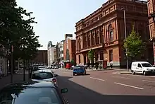 Royal Avenue is in the Cathedral Quarter. Beginning from the Donegall Place junction with Castle Place and Castle Street, which is the hub of Belfast city centre, the road runs north to the North Street crossing where the former Bank of Ireland once stood. A fire in summer of 2018 caused the front part of the building to burn leaving only the back of the building standing. Royal Avenue then angles northeast to the Donegall Street intersection continuing in a northeasterly direction as York Street.