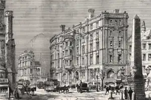 The hospital originally consisted of two beds in a house in St George's Circus. An adjoining house was acquired and the enlarged facilities were renamed the Surrey Ophthalmic Hospital in 1860. Three years later it became the Ophthalmic Hospital, with a further name change to the Royal South London Ophthalmic Hospital in 1869. In 1892 following the opening of a new enlarged building, designed by the architects Young and Hall, still in St George's Circus, it finally became known as the Royal Eye Hospital.[1]