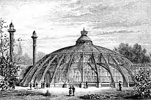 The largest greenhouse, the round-domed Winter Garden (1874) with a diameter of 57 metres (187 ft) and a height of 25 metres (82 ft), is made up of a number of concentric cast iron trusses, which are additionally supported halfway through their span by a circular Doric colonnade. The start and end points of the trusses rest on the ground so that the greenhouse presents the image of a glass dome supported by flying buttresses. Its enormous dimensions made it possible to plant Congolese palm trees in the rotunda. This Winter Garden, the main building of the complex, was also of great importance for the development of cast-iron architecture.[8]
