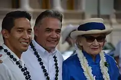 Bandmaster Clarke Bright (center) with Abigail Kinoiki Kekaulike Kawānanakoa (right)