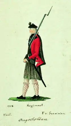 The 84th Regiment of Foot (Royal Highland Emigrants) was a British regiment in the American Revolutionary War that was raised to defend present day Ontario, Quebec and Atlantic Canada from the constant land and sea attacks by American Revolutionaries.[1] The 84th Regiment was also involved in offensive action in the Thirteen Colonies; including North Carolina, South Carolina, Georgia, Virginia and what is now Maine, as well as raids upon Lake Champlain and the Mohawk Valley. The regiment consisted of 2,000 men in twenty companies. The 84th Regiment was raised from Scottish soldiers who had served in the Seven Years' War and stayed in North America. As a result, the 84th Regiment had one of the oldest and most experienced officer corps of any regiment in North America.[2] The Scottish Highland regiments were a key element of the British Army in the American Revolution.[3] The 84th Regiment was clothed, armed and accoutred the same as the Black Watch, with Lieutenant Colonel Allan Maclean commanding the first battalion and Major General John Small of Strathardle commanding the second.[4] The two Battalions operated independently of each other and saw little action together.