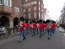 Today, the band performs throughout Denmark and abroad. The DKLM's area of responsibility accounts for the national capital, Copenhagen. When on parade, they wear the full dress uniform of the Life Guards (a scarlet tunic, blue trousers, and a bearskin cap). It is mainly seen accompanying the Guard Company when it executes the changing of the guard in front of Amalienborg, where the band plays traditional military marches. It takes part in the annual Tattoo of Den Kongelige Livgarde at Rosenborg Castle. The repertoire of the DKLM of today is very diverse and spans a lot of genres. The band almost exclusively plays Kong Christian stod ved højen mast, the Royal anthem, in the presence of the monarch or other Danish members of the House of Glücksburg. In addition, to its ceremonial role, musicians of the DKLM are trained infantryman who serve with the regiment.[2]