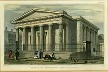 The first building to be used by the school was quite unsuitable. Situated at 6 Commutation Row, Liverpool, opposite the potteries of Shaw's Brow (now William Brown Street), two recently erected houses were rented by the charity for the sole use of the school. They were much too small and by 1800 enough money had been raised to erect a purpose-built school nearby, on the site later occupied by the Odeon cinema on London Road. Designed by John Foster junior (later Architect & Surveyor to Liverpool Corporation) the school was now well established and would stay on this site for the next 50 years.[6]
