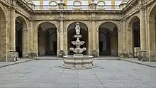 Renaissance architecture provides the main points of reference, with Herrerian influences in its floor plan, courtyards, and the details of the façades. There are also motifs reminiscent of architects Sebastiano Serlio and Palladio. The stone façades are modulated by pilasters on pedestals.[1]
