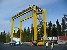 There are also electric rubber tired gantry cranes.[4] The first electrified rubber-tyred gantry cranes (ERTG) in China was unveiled by the She Kou container terminal (SCT) in Shenzhen in Aug 2008. Rubber-tired gantry cranes are also being electrified at the Port of Long Beach to improve air quality, with funding from the California Energy Commission.[3]