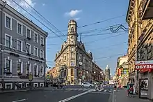 • No. 40 — former Ioffe revenue house, 1913. The flatiron building with decorative tower serves as an architectural dominant of the square.
