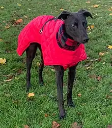 Lurcher with rug. Due to the short fur and slender build of most lurchers, it is common to see them dressed in cold weather.