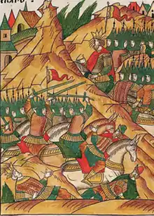 After the Ottoman invasion of Serbia in the 14th century, Serbian refugees found refuge in Russia.[4] Lazar the Serb and Pachomius the Serb were some of the notable Serbs in Russian medieval history.[5] Elena Glinskaya, the mother of Russian emperor Ivan the Terrible was maternally Serbian.[6] The Orthodox worship of Saint Sava was established in Russia in the 16th century.[4]