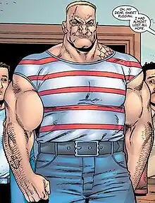The Russian is contacted at his home in Kazakhstan by American crime lord Ma Gnucci, who offers him ten million dollars to kill the Punisher. The Russian agrees to the deal, boards a Russian airliner to North America, crashes it above Canada, and crosses the border into New York City, where he is briefed by Gnucci.[2][3] The Russian is then brought to the Punisher's current address, and engages the vigilante, their fight (which the Russian dominates) bringing them into the apartment of the Punisher's morbidly obese neighbor, Mr. Bumpo. The Punisher burns the Russian's face with a hot pizza that Bumpo had been dining on, trips him, and then throws Bumpo on top of him. The Russian asphyxiates under Bumpo, and has his head cut off by the Punisher, who uses it to intimidate what remains of Ma Gnucci's forces into surrendering.[4][5][6]