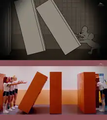 A screen capture of an Itchy & Scratchy scene featured in the music video and the scene where the members reenact it.
