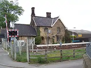The main railway building, which remains to this day and is now grade II listed, was designed by the architect G T Andrews and was built in 1850 at the request of the York and North Midland Railway who owned the line through acquisition.[5][6] Immediately to the west of the station is an automatic barrier level crossing and a lattice-work iron bridge over the River Esk.[7] The original Whitby and Pickering Railway bridge was made from Baltic pine and covered a distance of 312 feet (95 m), crossing the river on a diagonal compared to its flow.[8][9] The design of the station was similar to that at Sleights railway station, but with Tudor arches and Tudor chimneys.[10]