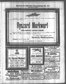 Ryszard Markwart died on 16 August 1906 in Międzyzdroje,[7] while swimming in the Baltic Sea. He was buried at the Nowofarny Cemetery, in a ceremony attended by a multitude of Polish inhabitants of Bydgoszcz and its surroundings.[8]