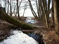 Bottom fauna includes some 53 species, typically endurable to nutrient-rich aquatic environments offering stagnant waters and low levels of oxygen - most commonly various species of Oligochaeta and Pisidium. An inventory in late 1999 / early 2000 also documented larvae of Chironomidae flies and Asellus aquaticus crustaceans; A few species of beetles and caddisflies, including species more typical for moist environments such as wetlands and marshes. Also species sensitive to acidification, such as Gammarus pulex and Baera pullata, were recorded. Near the mouth of the stream various species of mayflies common to exposed lake shores and running waters were documented.[3]