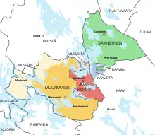 Säyneinen itself was first mentioned in 1638 as Säynäis. It was a part of the Liperi parish and since 1670, the chapel community of Kaavi.[3] Kaavi became a separate parish in 1802[4] and a separate municipality in 1875.[5] Säyneinen was separated from Kaavi as a parish in 1917 and as a municipality in 1924. The municipality was consolidated with Juankoski in 1971, but the parish remained separate until 2003.[6]