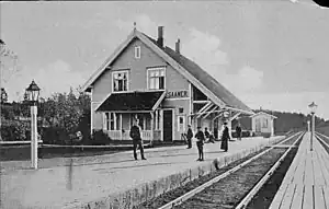The station became unmanned on 1 January 1973 and was closed on 21 June 1996.[1] The line was replaced by a double tracked line allowing speeds up to 160 kilometres per hour (99 mph).[3] In 2003, a family bought the station with head house for 1.3 million kr.[4]