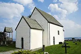 The earliest existing historical records of the church date back to the year 1280, but it was likely built around the year 1140. The Romanesque stone church has a rectangular nave and narrower, rectangular chancel. According to tradition, the church was owned for a time by Queen Margrete Skulesdatter. During the restoration in 1883, the windows were greatly expanded and given a neo-Gothic shape, and the steeple which had stood on the roof for hundreds of years was removed. The church was restored in again in 1966, under the leadership of Håkon Christie. Windows and portal openings, which had been greatly expanded in the 19th century, were then restored to their original form and size, including the use of the medieval frame stones, which had been preserved. The stone altar in the choir is the only thing left of the original inventory. The baptismal font is also from the Middle Ages, but the rest of the furniture is newer.[3]