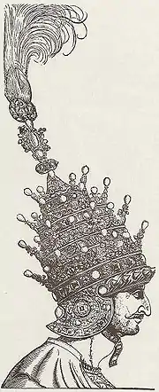 The helmet-crown consisted of four crowns set inside an Austrian-style helmet, and was topped by "a plumed aigrette with a crescent-shaped mount".[3] The crown was made of gold, and studded with "enormous twelve-carat pearls, a head band with pointed diamonds, forty-seven rubies, twenty-seven emeralds, forty-nine pearls, and a large turquoise".[4] The total value of the piece was estimated at 115,000 Venetian ducats.[5]