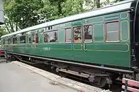The policy under which the Southern Railway operated set trains continued into the Southern Region of British Railways; sets were disbanded and created as BR tried to create a new timetable.[2] Since 1949, the official livery for all main line coaches had been crimson and cream, in seven years the whole of the Southern Region fleet should be crimson and cream but that wasn't the case as many sets were still in Southern Railway malachite green.[2] In 1959, as the Kent Coast electrification scheme was completed most restriction '0' were withdrawn at the same time. This decline continued as BR had more modern Bulleid and Mark 1 coaching stock until 1967 where the last was withdrawn.[2] Many Maunsell coaches were sold by BR to heritage railways were they restored and operated.