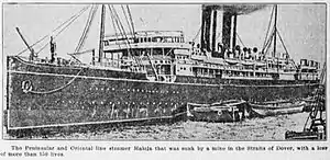 SS Maloja was an M-class passenger steamship of the Peninsular and Oriental Steam Navigation Company. She was completed in 1911 and worked a regular route between Great Britain and India. In 1916 in the First World War she was sunk by a mine in the English Channel off Dover with the loss of 155 lives.