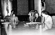 Raúl Alfonsín (far left) and Saúl Ubaldini (far right) in 1984 at Casa Rosada