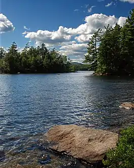 The lake covers an area of 1,608 acres (651 ha), entirely within the boundaries of New York's Adirondack Park, a mean depth of 28 feet (8.5 m), and a maximum depth greater than 50 feet (15 m).[4] It lies at an altitude of 1,725 feet (526 m).