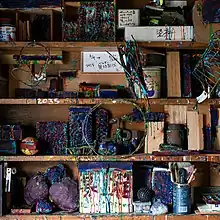 As a member of Gutai, Horio produced sculptural canvasses with colorfully painted fabrics arranged and attached in different shapes.[5] After Gutai’s dissolution in 1972, Horio increasingly developed more experimental processual approaches that included performances, installation artworks and interventions into urban and natural environment. The act of applying paint continued to play a central role in these works, yet Horio used speed and spontaneity to spur his creative process. In the mid-1980s, Horio began applying paint on objects with one color each day, a method he called “ironuri” (paint placement), which resulted in the substantial alteration of the shapes of the original objects. In 1997 he developed his “ippun dahō” (one-minute hitting method)[6] of making multiple drawings or paintings in a row within a few minutes, a process which he continued to explore in his performances as well. Then in 2002, in reference to the Gutai Card Box (1962),[7] Horio began making ¥100-Yen Paintings, where exhibition visitors could buy drawings at a booth that resembled a vending machine for the equivalent of about 1 Euro, in which Horio or his collaborators hid and spontaneously drew. As part of his solo show at the Ashiya City Museum of Art & History in 2002, Horio created a series of performances for every one of the 38 days. In his performances and workshops Horio involved the audiences in spontaneous activities, which frequently built upon his methods of producing a great number of works at a fast pace in a short amount of time and which also often escalated into a collective creative frenzy.[8] Unimpressed by the power of institutions and the art market, Horio dismantled distinctions such as between artist and audience or between works of high art and everyday practices. Horio’s work also includes the woodblock print series Myokonin-den (1992–2009), which resulted from his collaboration with Shūji Hisaka, a colleague from his workplace, as well as a large number of drawings depicting disaster-stricken scenes in and around Kobe, which he created in the aftermath of the Great Hanshin earthquake in March 1995.