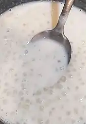The pearls are submerged in water for generally a whole day, then drained. This time varies according to the source of the recipe (some sources say that just one hour is necessary). Then red wine, milk or fruit juice is boiled and water, cloves and cinnamon are added to it. When boiling the mixture again, the sago pearls are added, being stirred constantly to avoid it from sticking on the bottom of the pan. Finally, sugar is added and the mixture is stirred until it gets the wanted consistency (it can be smoother or harder, and more liquid or solid).[4]