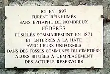 During the demolition of the annex to the cemetery in 1897, nearly eight hundred skeletons were discovered, still clothed in military uniforms. Examination of the uniform buttons allowed these remains to be identified as those of fédérés — soldiers who fought with the insurrection of the Paris Commune — who were summarily shot and hastily buried in May 1871. In 1897, their remains were reinterred — again in an unmarked mass grave — along the wall on the south side of the current cemetery. A commemorative plaque has since been placed there.
